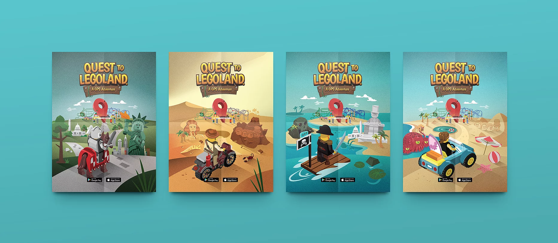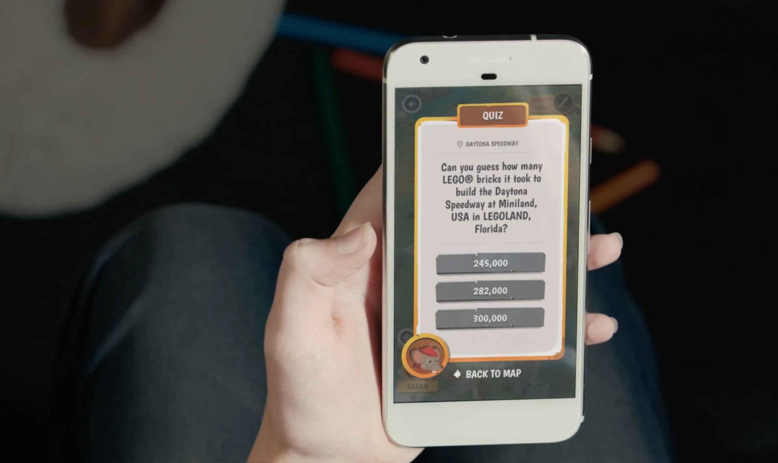 Quest to LEGOLAND maps a route to LEGOLAND using real-time GPS data to pull in landmarks as kids travel. The landmarks become part of a LEGO-themed story, and as kids move on the map, they unlock games and complete trivia questions to complete their quest.